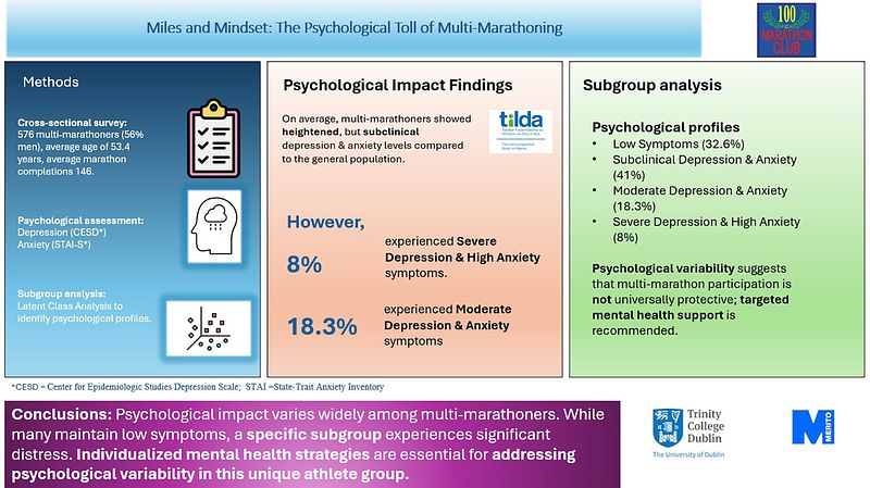 A cross-sectional online survey collected data from 576 multi-marathoners (56 % men), mean age 53.4 years (SD 9.88), average marathon completions of 146 (SD 196.77). Depression and anxiety were assessed using CESD-8 and STAI-S-6, and compared to TILDA, an Irish longitudinal ageing study. Age and gender trends were analysed with linear regression. Latent Class Analysis identified subgroups, while t-tests and ANOVA explored group differences.